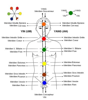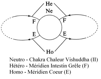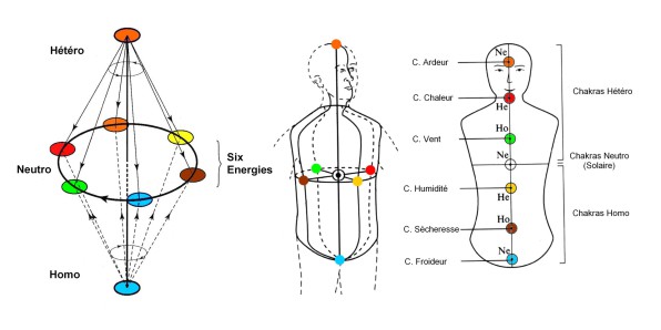 Dans le système des énergies unifiées du corps humain, les méridiens sont des composants Yang (hétéro). Cela est démontré par leurs présences à la surface du corps et la trajectoire linéaire des méridiens (structure linéaire de nature Yang). Les chakras internes sont des composants Yin (homo) du système énergétique interne, car ils sont situés au plus profond du corps et ont la forme de vortex (structure circulaire de nature Yin).
