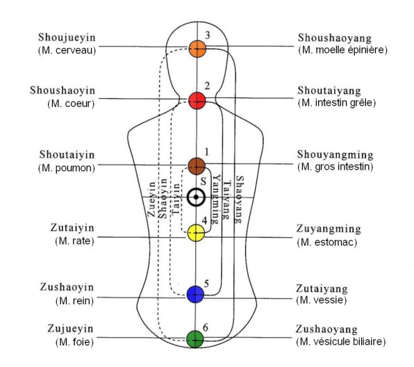 Étant donné que le système des Six Énergies est polyvalent et stable et présent dans tous les phénomènes, considérons l'axe de symétrie des Six Énergies dans le système des Energies Unifiées Six Ki du corps humain.