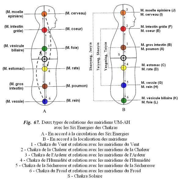 Reçu depuis l'environnement extérieur l'énergie des Six Energies est transmise des chakras aux méridiens internes ; de la même manière que le sang est distribué du coeur aux vaisseaux sanguins. Ainsi, les méridiens sont également inclus dans la boucle globale de la circulation de l'énergie fonctionnelle. Par ailleurs, les points d'acupuncture des méridiens sont d'autres voies supplémentaires à l'entrée et à la sortie des Six Energies.