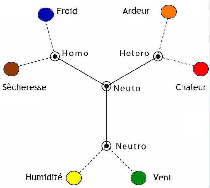 Ce fait nous permet de supposer une répartition structurelle de l’énergie. Il s'avère que les méridiens des mains sont reliés à deux énergies Hétéro (Chaleur et Ardeur) et à une énergie Homo (Sècheresse), et les méridiens des pieds, au contraire - à deux énergies Homo (Humidité et Froid) et à une énergie Hétéro (Vent). C'est le principe de neutralisation de Neutro, qui vise à éliminer les forces extrêmes Hétéro et Homo. Même dans l'ancien symbole Yin-Yang, on trouve l’expression de ce principe. Dans la partie blanche du symbole Yang (Hétéro) se trouve une inclusion noire (Homo), et dans la partie noire du symbole Yin (Homo), on trouve également une inclusion blanche (Hétéro).