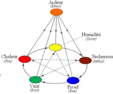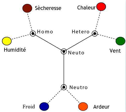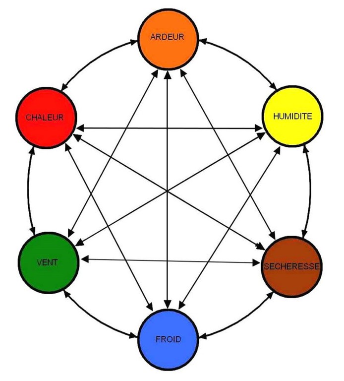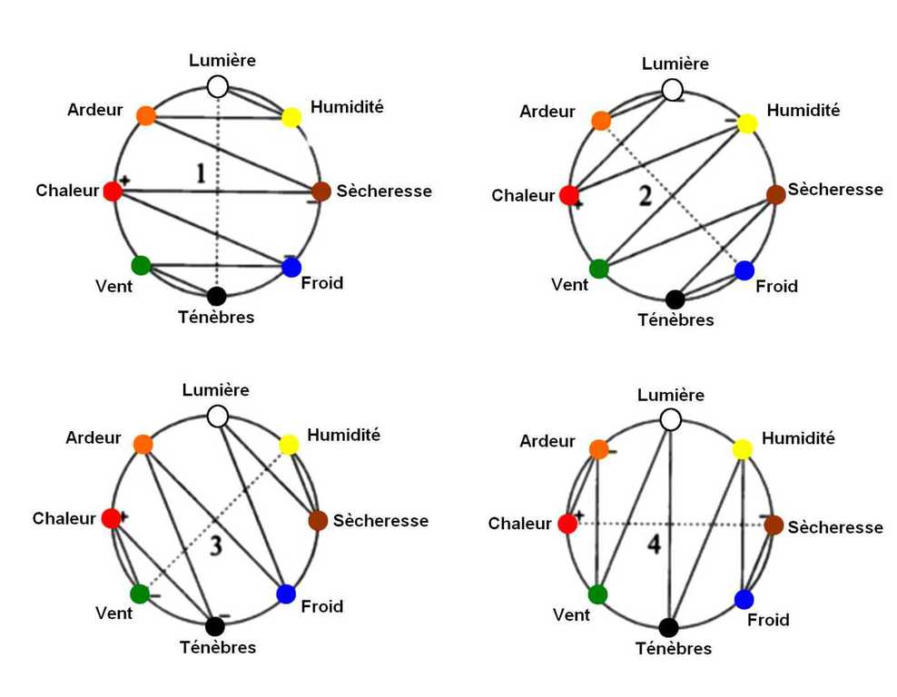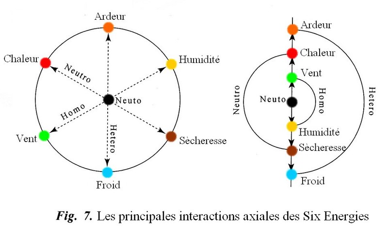 Considérons les principaux axes dans la théorie des Huit Eléments/Energies. Ces axes sont constitués des éléments suivants : Vent – Humidité, Chaleur – Sécheresse, Chaleur Extrême (Ardeur) – Froid, et Lumière – Ténèbres. Dans chaque paire, la première énergie possède des propriétés Yang (Hétéro), et la seconde des propriétés Yin (Homo). Les énergies se conjuguent en fonction de leur statut. Ainsi, le vent et l'humidité sont des énergies initiatrices, la chaleur et la sécheresse sont des phases dynamiques d'expansion et de contraction de l’énergie, tandis que l’ardeur et le froid sont des énergies de contrôle et de stabilisation. La lumière et les ténèbres agissent également comme élément de contrôle mais également comme énergies de l’esprit et spirituel. Ici, les axes principaux sont clairement exprimés dans le graphique (des relations six ki) du cycle de circulation de l'énergie sous forme de composantes énergétiques disposées en axe opposé l'un à l'autre.