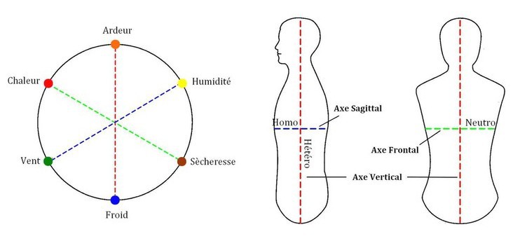 L'axe Ardeur - Froid correspond aux paires Moelle Epinière - Vessie (énergie de niveau Yang/Hétéro), et Cerveau - Rein (énergie de niveau Yin/Homo). La similitude structurelle entre les systèmes nerveux et urologique est également manifeste.